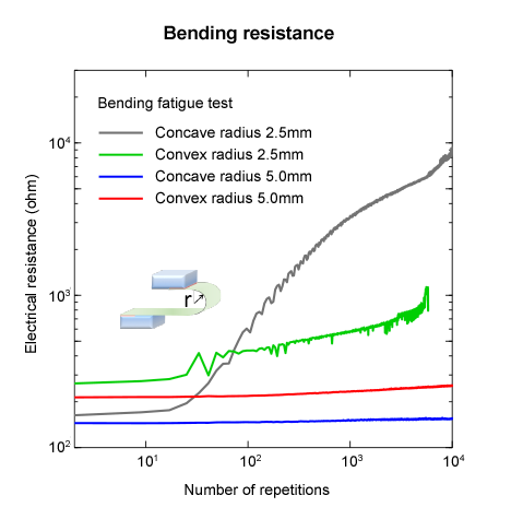 Zusätzlich werden Biegetests durchgeführt, um weitere Anwendungen in der flexiblen Elektronik zu berücksichtigen (Abbildung 5). Bei einem Krümmungsradius von 5 mm ändert sich der elektrische Widerstand selbst nach 10.000 Biegeermüdungstests kaum. Bei einem Radius von 2,5 mm beginnt der elektrische Widerstand nach etwa 20 bis 30 Wiederholungen zu steigen, was darauf zurückzuführen ist, dass das zugrunde liegende PET-Substrat zu deteriorieren beginnt. Es ist sehr wahrscheinlich, dass dies praktisch als flexibles Bauteil verwendet werden kann.