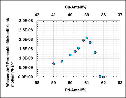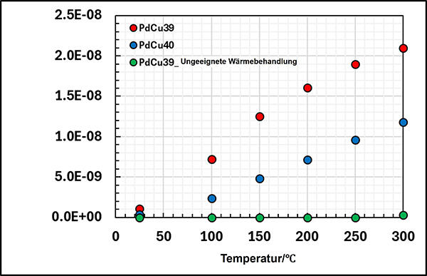 Unter den PdCu-Legierungsmembranen weist PdCu40 (eine Legierung mit 60 % Palladium- und 40 % Kupferanteil) bekanntermaßen die höchste Wasserstoffdurchlässigkeit auf. Die Reinigung von Wasserstoff mit PdCu40 erfordert jedoch hohe Temperaturen von etwa 400 ℃. TANAKA untersuchte das Mischungsverhältnis von Palladium in PdCu-Membranen und konnte die Leistungsfähigkeit mit PdCu39 (61 % Palladium, 39 % Kupfer) entscheidend maximieren.