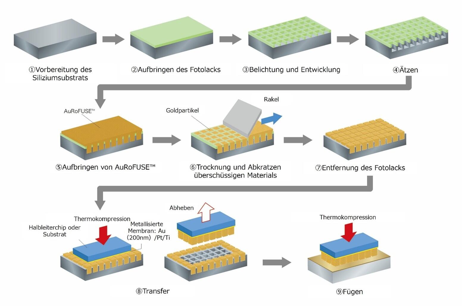 AuRoFUSE™ Preforms ist ein Niedrigtemperatur-sinterndes Gold-Bondmaterial auf Basis einer Paste aus Goldpartikeln im Submikrometerbereich und einem organischen Lösungsmittel. Im Thermokompressionsprozess (20 MPa bei 200 °C für 10 Sekunden) entsteht eine vertikale Stauchung von etwa 10 %, während die laterale Verformung gering bleibt. Daraus resultiert eine für industrielle Anwendungen ausreichende Scherfestigkeit.