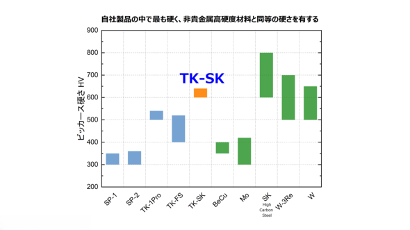 TANAKA's Pd alloy material "TK-SK," released in 2024, meets these demands. Traditionally, the hardness of Pd alloys has been said to be "at most around 560 HV, no matter how high" (FUSE). However, TK-SK exceeds this limit, achieving a hardness of up to 640 HV. This product was developed by combining TANAKA's extensive development data accumulated over the years with a new manufacturing method focused on hardness.