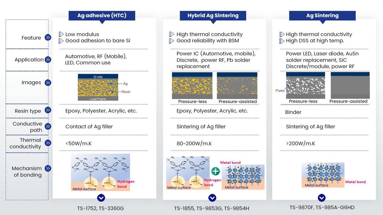 Figure 1 shows the lineup of silver die attachment products by TANAKA PRECIOUS METAL TECHNOLOGIES, with a new hybrid sintering in the center. Figure 2 compares hybrid sintering with other products.
