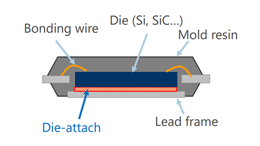 Conductive adhesives for die bonding are used with Si for power devices and SiC and GaN next-generation semiconductors.
