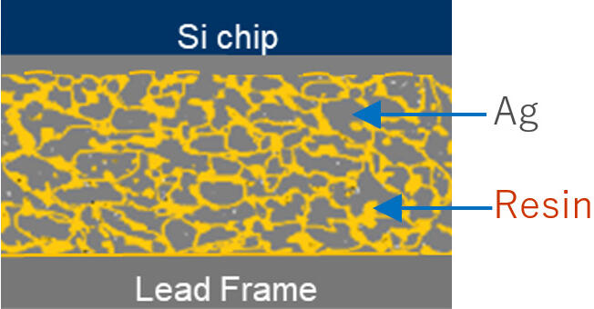 Die-bonding refers to the process and materials used to attach semiconductor chips to substrates. Silver adhesive pastes are used for this bonding, exhibiting high thermal conductivity and reliability. They are used in fields such as next-generation power semiconductors and electric vehicles, where high heat resistance and performance are required. TANAKA offers a lineup of products that combine metal sintering and resin bonding using its proprietary hybrid technology to achieve stress relaxation and high bonding reliability.