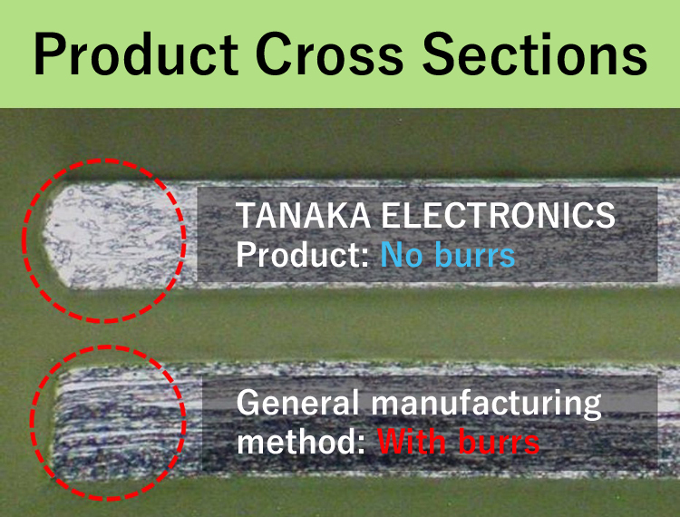 Rolling is a processing method in which metal materials are fed into rotating rolls to manufacture thin and flat ribbon materials. Using its unique technology to roll wires with a diameter of 100 to 600 μm, TANAKA has succeeded in manufacturing ribbon materials without burrs on the end faces, which is not possible with slitting. In order to meet the need for advanced bondability for automotive devices, the company has also reduced the surface roughness of its products to an average of 1 μm or less and has implemented surface cleanliness management equivalent to that of bonding wires to provide semiconductor-quality products.