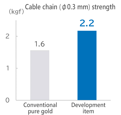 Compared to conventional pure gold, the new material has higher chain strength, and when processed into 0.4 mm double curb chain, it achieved 1.6 times the strength of conventional chains.