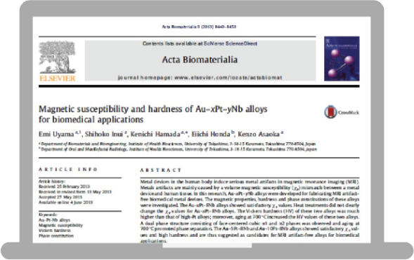Uyama E, Inui S, Hamada K, Honda E, Asaoka K. Magnetic susceptibility and hardness of Au-xPt-yNb alloys for biomedical pplications. Acta Biomater. 2013