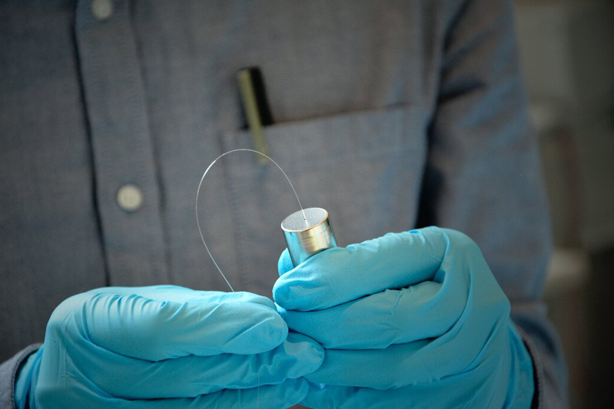 円筒型電池(18650規格)に、直径約150ミクロンの光ファイバーセンサーを差し込む。電池の中心部に光ファイバーを直接挿入することで、センサーによって内部の温度と圧力を、これまでにない高精度で監視できる。提供:コレージュ・ド・フランス:ベンジャミン・カンプシュ、フランス電気化学エネルギーデバイス研究ネットワーク