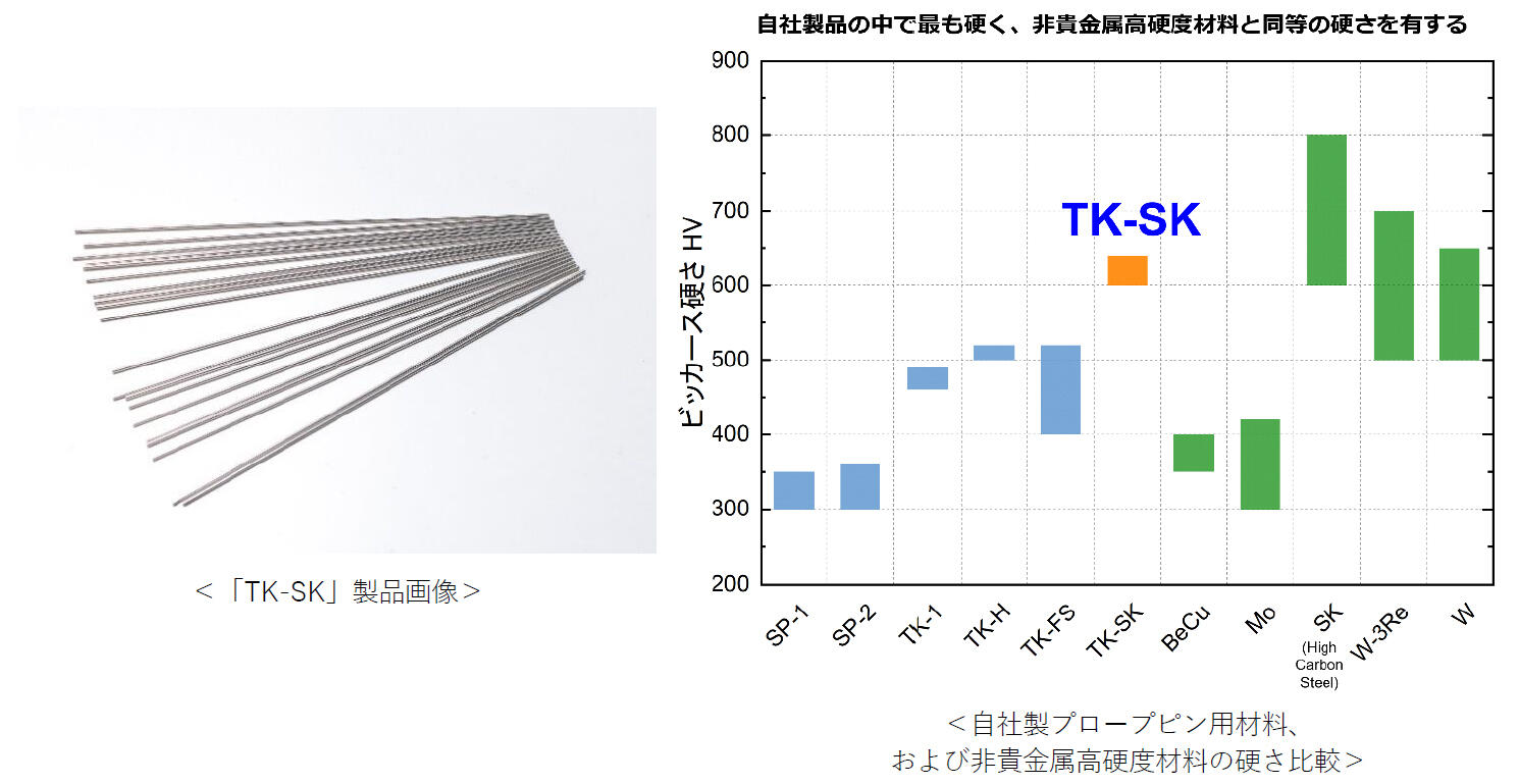 田中貴金属工業では、半導体製造の前工程及び後工程で実施される検査装置用として様々な貴金属のプローブピン用材料を製造し提供しています。今回発表する「TK-SK」は、プローブピン用パラジウム合金材料として、最大硬度640HVを有するため、主に、後工程で行われる通電試験のファイナルテストに用いられるテストソケット向けとしての用途を想定しています。