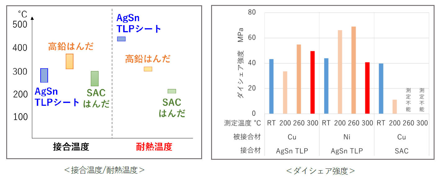 パワー半導体を含む半導体デバイスは、高温による故障や低寿命化といった影響があるため、高温耐熱性が求められます。また、パワー半導体パッケージ製造において、現在メインで採用されている接合材料は、環境への負荷から別材料への切り替えが進んでいる(※2)高鉛はんだや、耐熱性が低いSACはんだ(※3)、銀(Ag)焼結剤などが一般的です。本製品は加熱温度250℃で液相拡散接合(※4)が可能です。接合後、耐熱温度が480℃まで上がるため、既存材料よりも高い耐熱性を有します。また、接合強度においては最大50MPaを維持するため、様々な被接合材に対応が可能です。さらに、本製品は、鉛フリーの接合部材であること、3,000サイクルのヒートサイクル試験を通過した高接合信頼性も特徴です。
