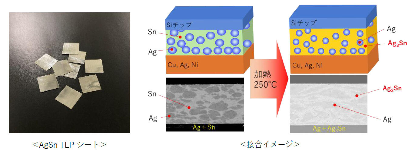 近年、EV、HV、産業インフラ等の用途を中心に、大電流タイプのパワー半導体のニーズが高まっています。それに伴い、大型化するSiチップの接合において、高い信頼性を担保しながら、大きな面積を接合できる材料が求められています。今回発表する「AgSn TLPシート」は、最大20mmまでの半導体チップ接合に対応しています。さらに、3.3MPaの低加圧で接合が可能であり、半導体製造における歩留まり改善にも貢献します。
