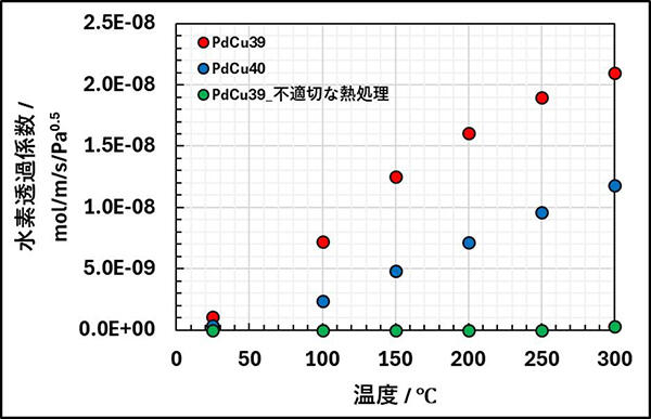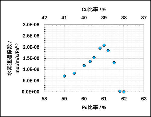 PdCu系合金膜の中ではPdCu40(パラジウム含有率が60%、銅含有率が40%の合金)が最も水素透過性能が高いと言われています。しかし、PdCu40で水素を精製するためには、400℃前後の高温での運用が必要でした。田中貴金属は、PdCu系水素透過膜のパラジウム含有率に着目し、PdCu39(パラジウム含有率が61%、銅含有率が39%の合金)でPdCu系水素透過膜の最大性能を引き出すことに成功しました。