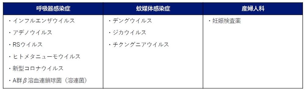 インフルエンザや新型コロナウイルスなどの呼吸器感染症をはじめ、デングウイルスやジカウイルスなど、幅広い感染症に対応した体外診断薬を展開しています。これらの検査キットは、唾液・血液・尿など多様な検体に対応し、医療現場における迅速かつ正確な診断を支援しています。