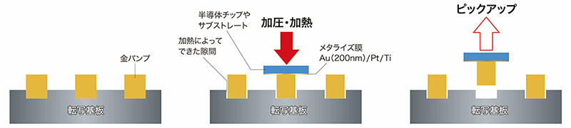 - ⑧ 金バンプを形成したい対象(半導体チップやサブストレート)を転写基板に当て、10MPa、150℃、1分の加圧加熱を行う。その後、垂直に基板を持ち上げると金バンプが転写される