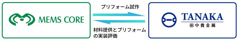 田中貴金属工業とメムス・コアは、それぞれの強みを活かし、材料提供とプリフォーム(金バンプ)試作および実装評価を双方向で連携することで、迅速な開発体制を実現しています。