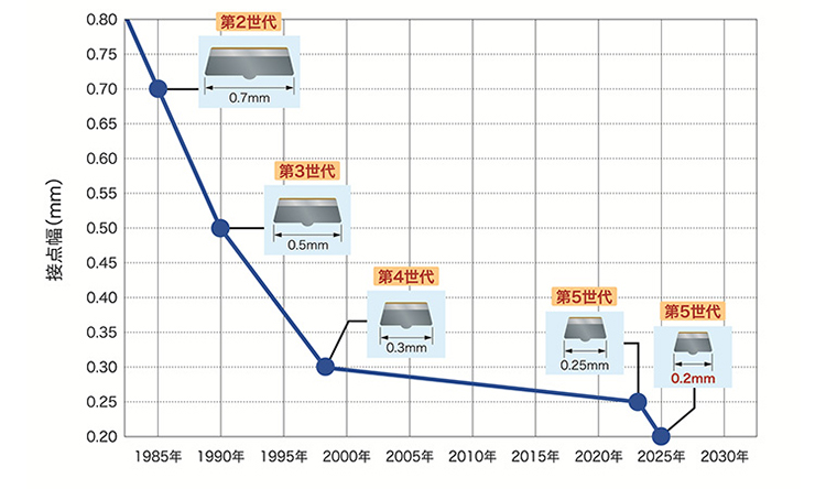 当社は、1970年代からシグナルリレー向け接点の開発を行っています。1998年には第4世代シグナルリレー向け接点(テープ幅0.3mm)、2023年には第5世代シグナルリレー向け接点(テープ幅0.25mm)の開発に成功しています。第5世代シグナルリレーは、通信機器、半導体検査装置、医療機器、ネットワークカメラ、スマート家電、自動車など、高い信頼性が求められる様々な分野で活用されています。