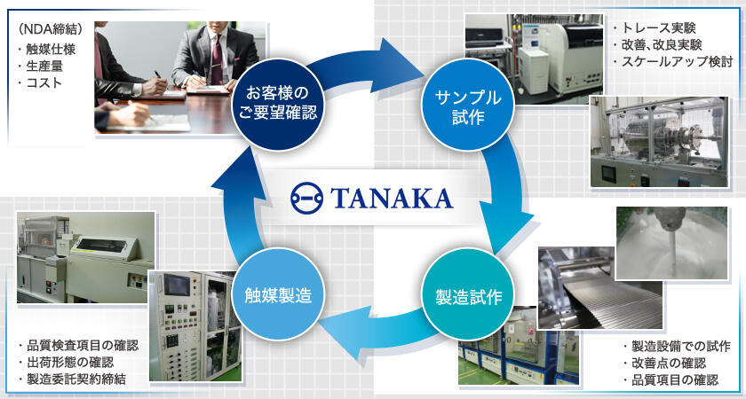 お客様が開発した貴金属系触媒と当社の多彩な貴金属原料、充実した触媒製造技術とを組み合わせ、低コストでの触媒製造を目指します。