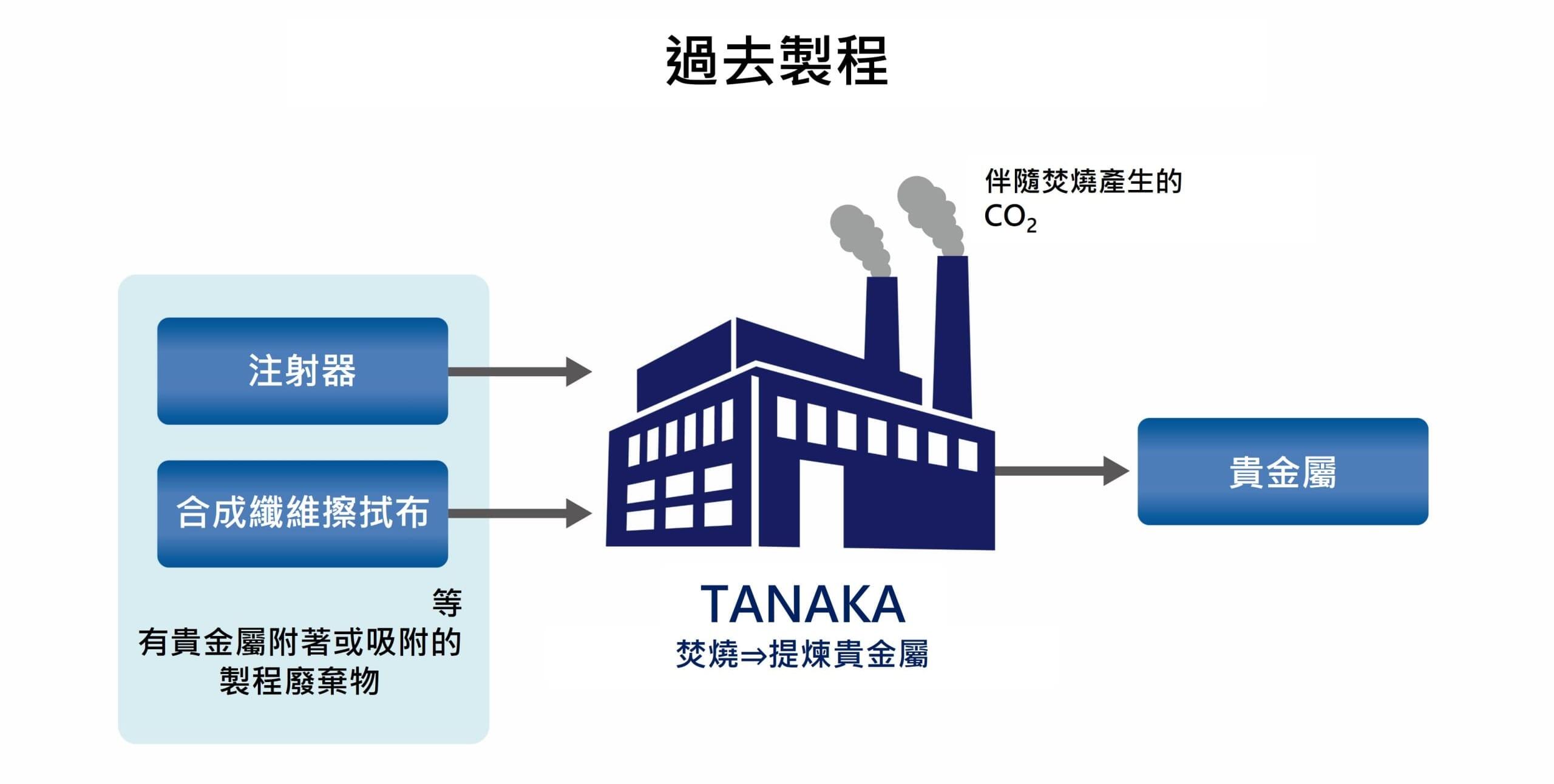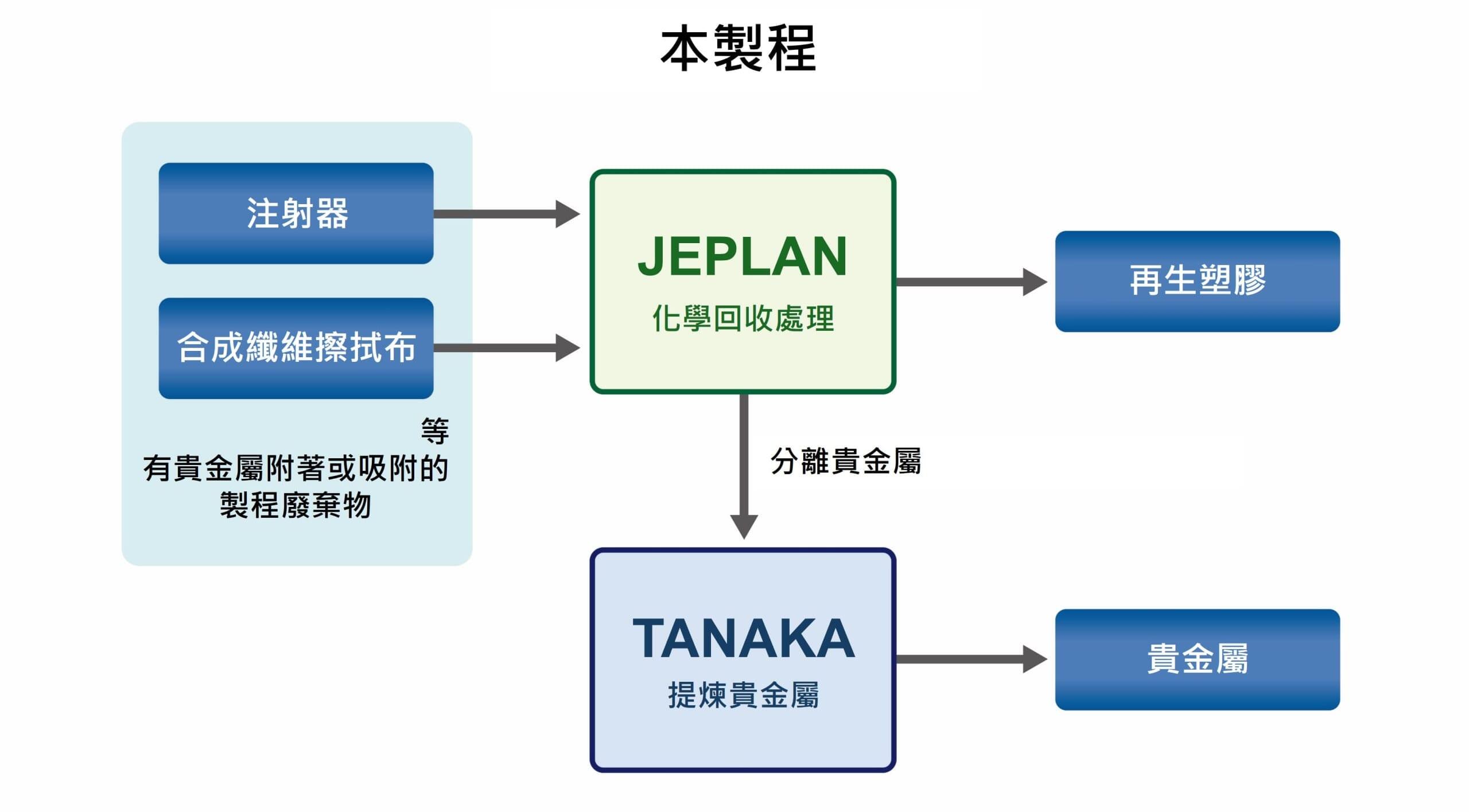 JEPLAN以一種稱作聚乙烯對苯二甲酸酯的塑膠為目標對象來建立獨家的化學回收技術。為了解決上述的CO2排放量課題,TANAKA藉由與JEPLAN的事業合作,正在研討除了過去採用焚燒處理的貴金屬回收製程以外,未來還可能利用化學回收處理。化學回收處理的目標對象估計是注射器、合成纖維擦拭布等塑膠。而在作為目標對象的貴金屬回收製程中CO2排放量預計可比過去抑制10%左右。