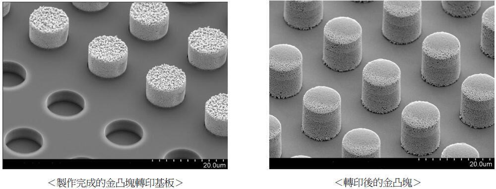 在這次的轉印技術中,由於可另外製作金凸塊,並將金凸塊轉印至目標位置,因此也能應用於複雜形狀。另外,對於憂心剝離液等造成損傷,而難以進入微影※3製程的半導體晶片或載板,也能加以應對。