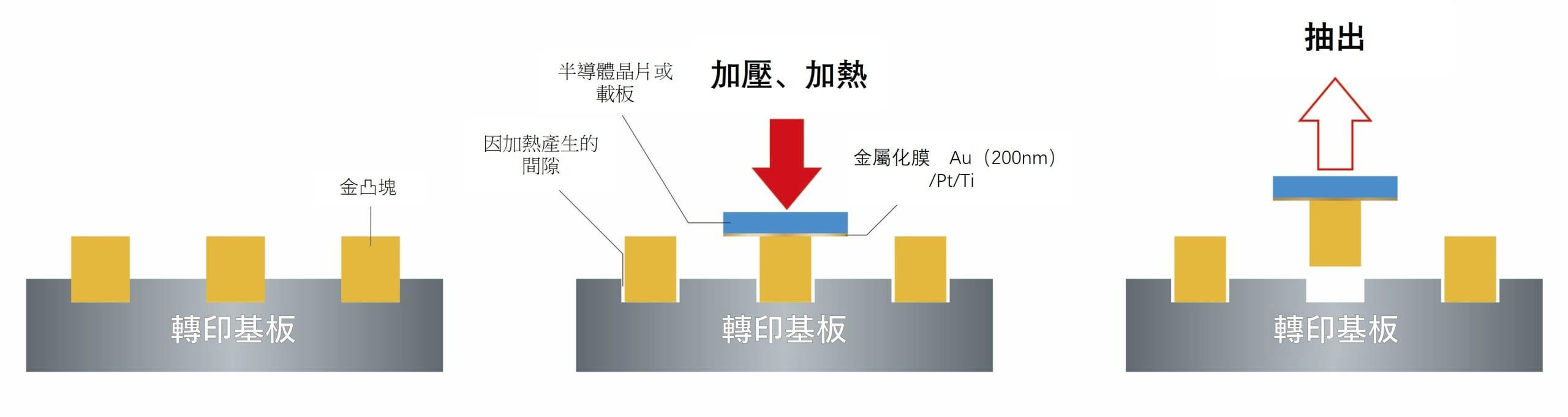 - 將欲形成金凸塊的目標(半導體晶片或載板)對準轉印基板,進行10MPa、150℃、1分鐘的加壓加熱。隨後垂直提起基板,金凸塊即完成轉印