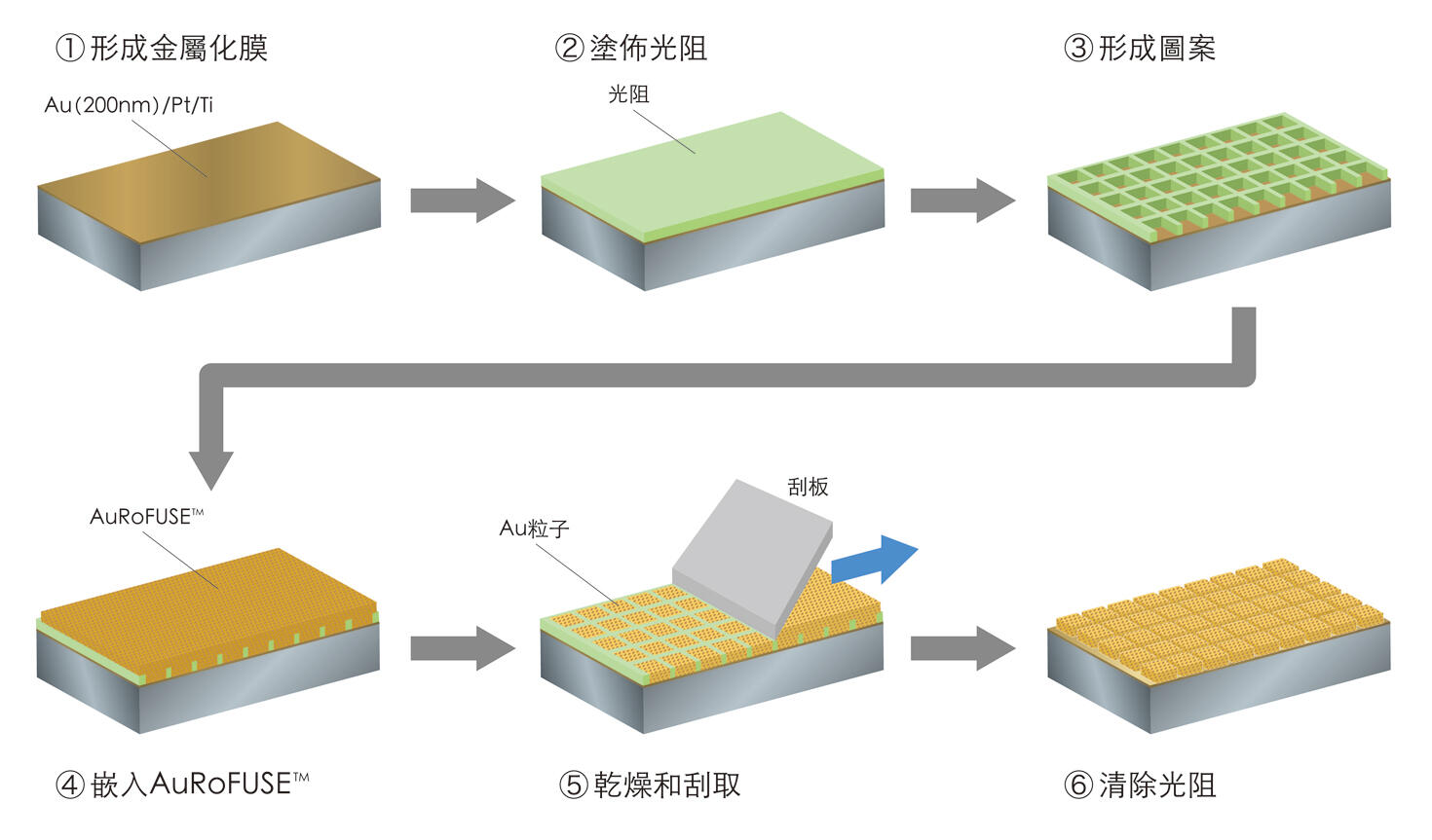 - 在常溫及真空下乾燥AuRoFUSE™,並刮取光阻上多餘的金粒子