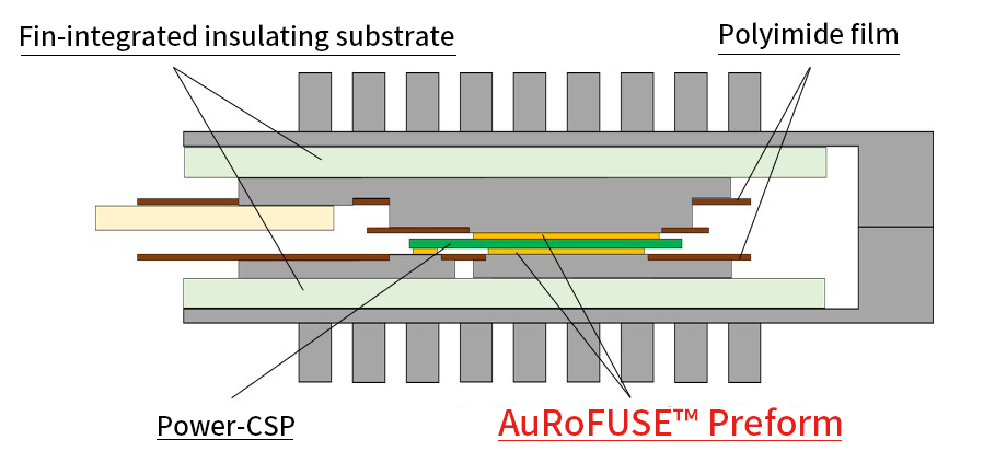 我們發現,將我們的AuRoFUSE™預製件應用於逆變器功率元件模組的晶片電極與基板迴路之間的黏合,與傳統焊料相比,有助於提高熱阻。此外,它還通過了歐洲汽車功率模組評估標準 (AQG324) 中規定的功率循環測試。