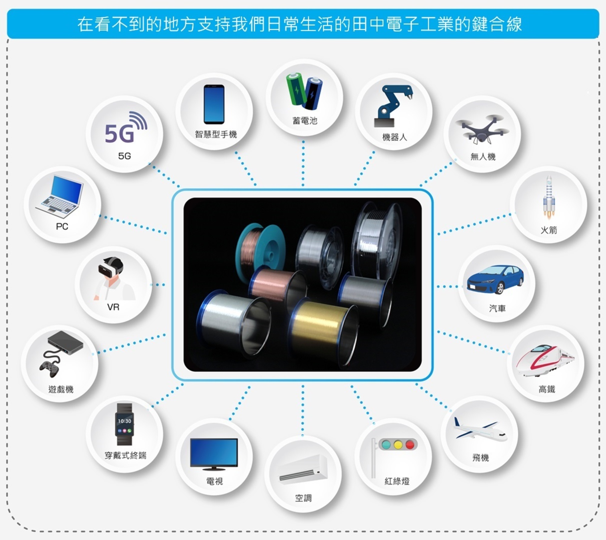 自成立以來,田中電子五十多年來致力於生產接合線,並擁有全球最大的供應量。我們在五個國家設有生產基地,產品銷往全球各地。憑藉在半導體產業累積的技術,田中電子工業提供各領域所需的高可靠性產品。
